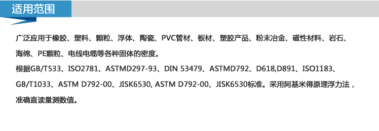 廣泛應用于橡膠、塑料、顆粒、浮體、陶瓷、pvc管材、板材、塑膠產品、粉末冶金、磁性材料、、海綿、pe顆粒、電線電纜等各種固體的密度。